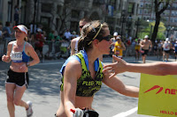 I was amazed at how many people were walking, not just on the hills, but wherever. And I had been seeing many walking from pretty early in the race. That meant that even with my slow run and walking through water stops, I was passing a lot of people. One thing that kept playing in the back of my mind was the thought how high can I place. I knew I wasn't running what I had set out to run, but I also knew I was still running while many others weren't. At the top of Heartbreak I was pretty sure it should be fairly clear sailing to the finish. I was debating how much I cared about my finish place. Caution ended up winning out, I continued casually trucking. Running down the hill hurt, but not terribly. The crowd at Boston College was loud and fun. There were a few people passing me, ones who had a hunger for doing well. I just watched them go by as I kept moving comfortably. Still, there were many more people being passed by me than I was passing. I offered a few of them electrolyte tablets if they looked like they were cramping, but no one took me up on the offer.